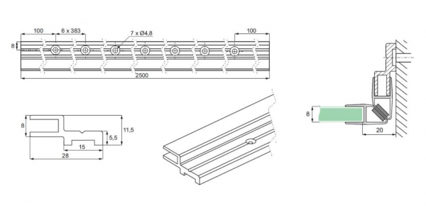 Lukkeprofil for magnetisk PVC list, aluminium, 8mm glass, 2,5m
